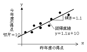 昨年度と今年度の入社試験問題を比較するために,多数の社員に両年度の問題を解答させた。昨年度の問題の得点をx軸に,今年度の問題の得点をy軸にとって,相関係数と回帰直線を求めた。〔結果〕から分かることはどれか。