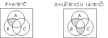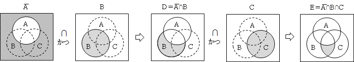 集合(A∩B∩C)∪(A∩B∩C)を網掛け部分で表しているベン図はどれか。ここで,∩は積集合,∪は和集合,XはXの補集合を表す。