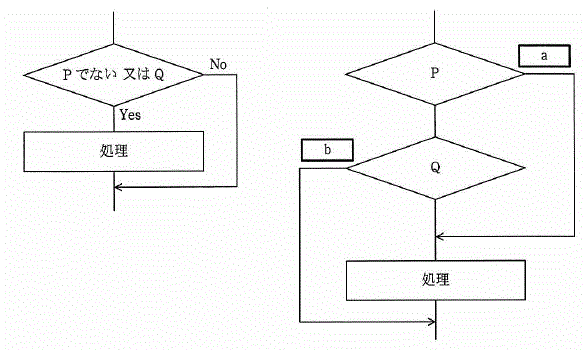 右の流れ図が左の流れ図と同じ動作をするために,a,bに入るYesとNoの組合せはどれか。