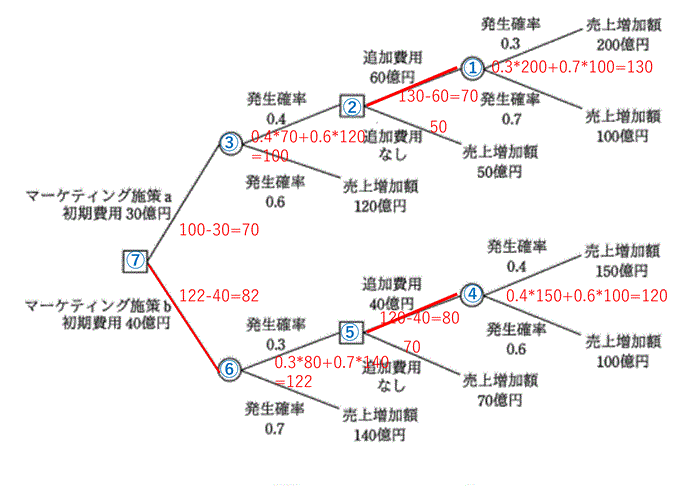 ビッグデータ分析の手法の一つであるデシジョンツリーを活用してマーケティング施策の判断に必要な事象を整理し,発生確率の精度を向上させた上で二つのマーケティング施策a,bの選択を行う。 マーケティング施策を実行した場合の利益増加額(売上増加額-費用)の期待値が最大となる施策と,そのときの利益増加額の期待値の組合せはどれか。