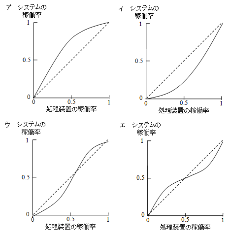 2台の処理装置が直列に接続されているシステムがある。両方の処理装置が正常に動作しないとシステムは稼働しない。両方の処理装置の故障の発生は独立しており,稼働率が等しい場合の,処理装置の稼働率とシステムの稼働率の関係を表すグラフの形はどれか。ここで,破線は処理装置の稼働率とシステムの稼働率が等しい場合を表す。