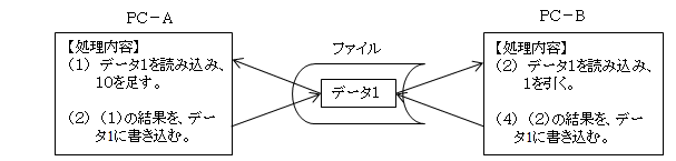 2台のPCから一つのファイルを併行して更新した。ファイル中の同一データ(データ1)に対する処理が(1)~(4)の順におこなわれたとき,データ1はどの値になるか。ここで,データ1の初期値は5であった。