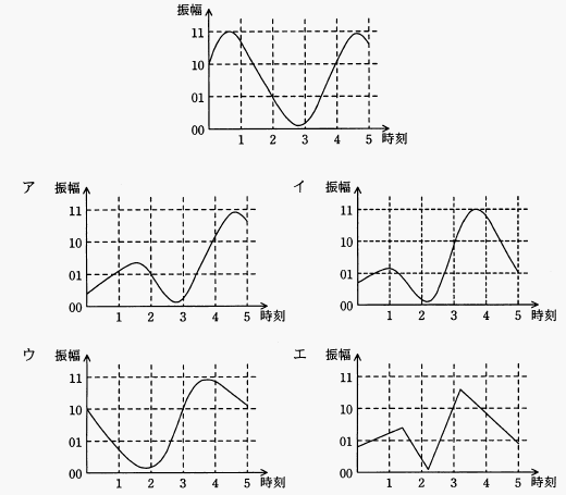 音声信号をディジタル化する。図の時刻1から時刻5のタイミングで標本化を行い,4段階に量子化(標本点に最も近い段階を選択)を行った。その後2ビットで符号化を行った。結果は「11 01 00 10 11」であった。同じ手法でディジタル化を行うと「01 00 10 11 01」となる音声符号を示す図はどれか。