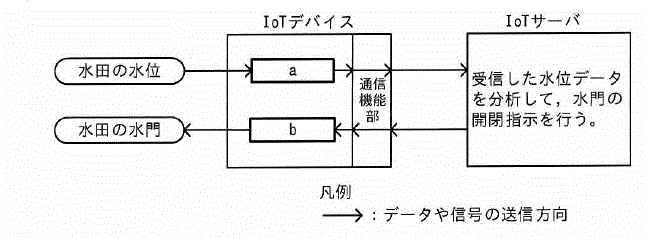 水田の水位を計測することによって,水田の水門を自動的に開閉するIoTシステムがある。図中のa,bに入れる字句の適切な組合せはどれか。