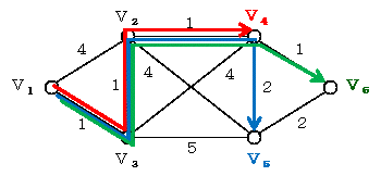 グラフに示される頂点V1からV4,V5,V6の各点への最短所要時間を求め,短い順に並べたものはどれか。ここで,グラフ中の数値は各区間の所要時間を表すものとし,最短所要時間が同ーの場合には添字の小さい順に並べるものとする。