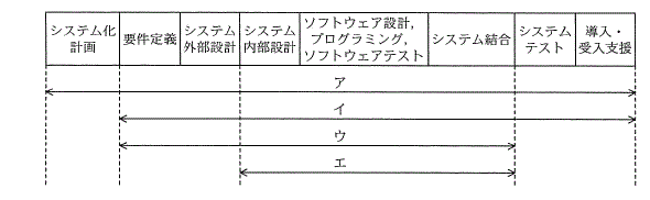 「システム内部設計フェーズからシステム結合フェーズまで」の開発プロセスは,仕様が明確になっており,成果物の完成が重要なので,請負契約が適する→エが〇