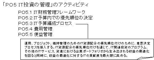 それぞれのプロセスは,さらにアクティビティに細分化されます。例えば「PO5 IT投資の管理」のプロセスは,5つのアクティビティがあります。