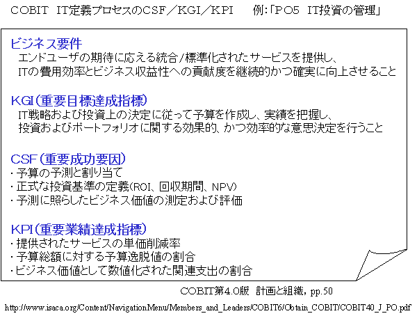 COBITでは,CSF/KGI/KPIを例示しています。ここでは「PO5 IT投資の管理」の一部分を例として示しました。