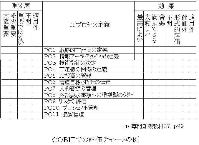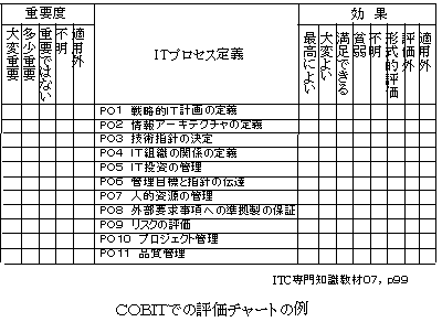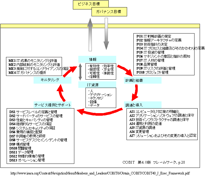 COBIT(Control Objectives for Information and related Technology)とは,情報システムコントロール協会(ISACA)により作成された,ITガバナンス能力を評価する標準です。その第4版の日本語版は,下記サイトから入手できます。