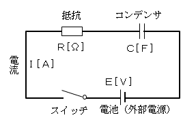 主要諸元 固定値の諸元 起電力 E 10v 電池(外部電源)の電圧。期間中一定 抵抗 R 5Ω 期間中一定 コンデンサ Cmax 10v コンデンサの最大容量 時刻tにおける諸元 コンデンサ容量 C(t) 電流 I(t) スイッチ操作時刻 切断時刻 Toff 10 程度が適切 再接続時刻 Ton Toff+5 程度が適切解説
