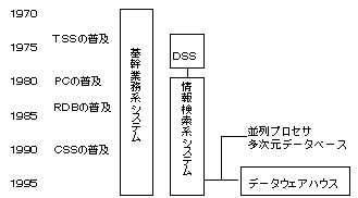 情報検索系システムは,1980年代を通して普及した。1980年代中頃には,RDB(Relational Database)の処理効率の改善(2)とパーソナルコンピュータ(以下「パソコン」という)の普及により,メインフレームから必要なデータを抽出してパソコンにダウンロードし,使いやすいパソコンソフトで多様に編集することが可能になった。さらに,1980年代末期から1990年代にかけて,ダウンサイジングが進み,CSS(Client-server System)が普及すると,必要なデータを利用部門のサーバに置いて,それをクライアントから検索加工する形態へと進んだ。 1990年中頃になると,並列技術やディスクアレイなどの発展により,巨大なデータベースを格納して検索することが実用化され,多次元データベース(Multi-dimensional Database)などの高機能で使いやすいツールが出現したことにより,データウェアハウスの概念が普及してきた。