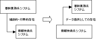情報検索系システムを普及する目的は,必要な人が必要なときに必要な情報を容易に得られるようにするだけではない。経営環境の激変に対処するには,基幹業務系システムを環境に応じて改訂する必要があるが,情報検索系システムを普及させることにより,基幹業務系システムを改訂が容易なシステムにすることができるのである。