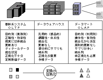 基幹業務系システムのデータからデータマートのデータへの変換を容易にする観点からも,データウェアハウスのデータは部品として使えるように正規化しておくことが必要なのである(木暮,1997,pp.103-113)。メインフレームでの基幹業務系システム,データウェアハウスおよびデータマートの関係を図7−4に示す。