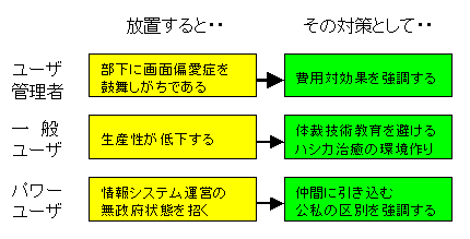 パワーユーザの存在は重要である。パワーユーザがいるからEUCが円滑に発展するのだし、トラブルが起こったときに現場で対応してくれる。頼りになる存在である。しかし、パワーユーザが画面偏愛症に罹ったときは、情報システム部門にとって大きな脅威になる。