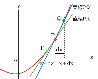 右図でP点(x=x)の傾きはP点の接線のx項の係数であり、その接線は、P点とQ点(x=x+dx、dxは小さい値)を通る直線PQの傾きで近似できます。すなわち、、