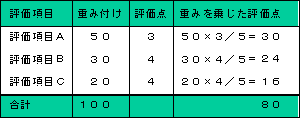 次に,全体を100点として,各評価項目に50点満点とか30点満点というようなウェイトを与え,その各項目について5段階法で評価するのです(評価が5のとき満点)。例えば50点満点の項目で,評価が3ならば30点になります。現在の状況は2だが情報化により4の段階に高めることが期待できるのであれば,現在は8点なのが16点になその合計がこの投資の効果とするのです。