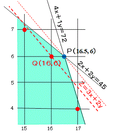 P点付近を拡大したのが下右図です。xとyが整数になる候補として、赤点が考えられます。目的関数(赤線)との関係から、直感的にQ点(x=16個、y=6個)が最適であるとわかります。