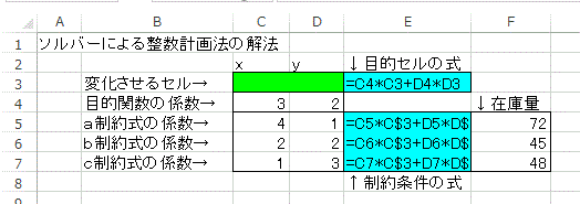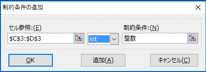 ソルバーでは、「xとyは整数値である」ことを、「制約条件の追加」で設定します。設定画面1で「追加」をクリックし、設定画面3で「int」を指定します。これだけでよいのだから簡単ですね。