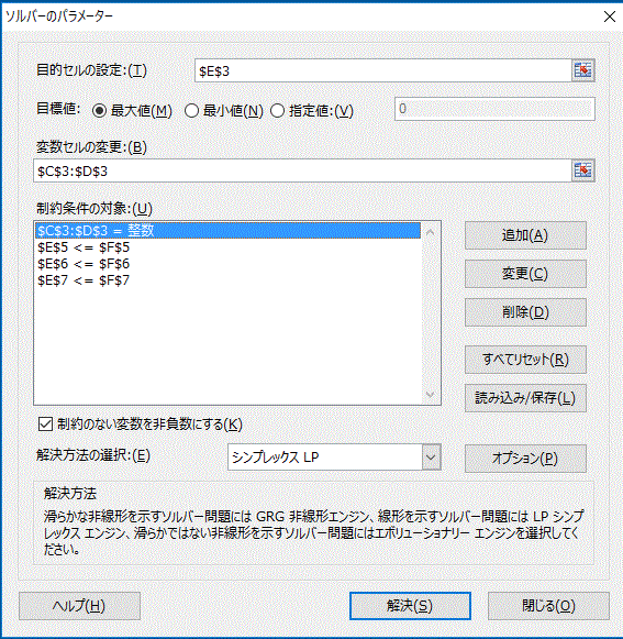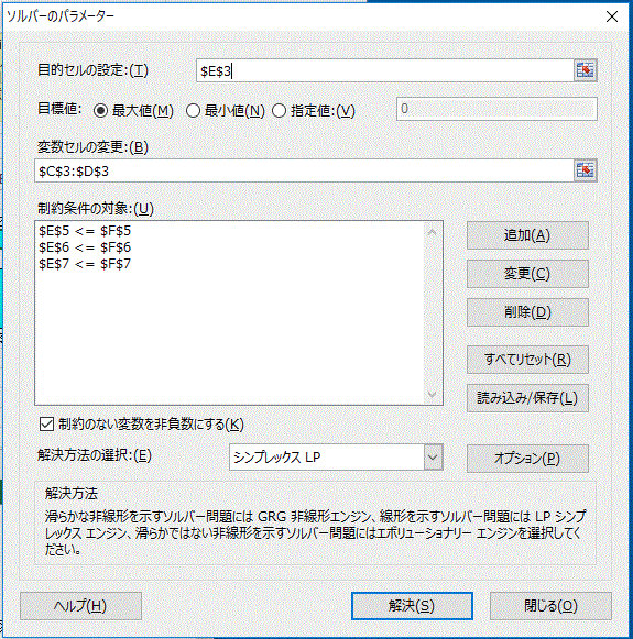 ソルバーによる((通常の)線形計画法の解法は、「Excelソルバーによる整数計画法の解法」で説明しました。