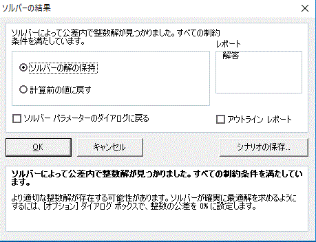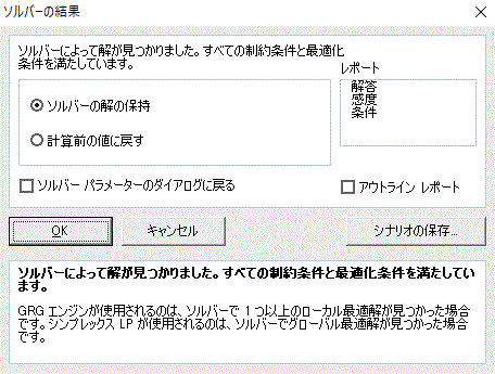 [解決]をクリックすると、最適解が得られると、次の画面が表示されます。