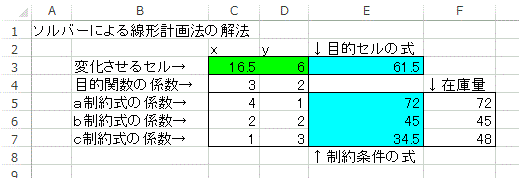 すなわち,「x=16.5,y=6のとき,目的関数は最大値61.5になり,制約条件はaとbは余裕がないが,cは48-34.5=4.5の余裕がある」ことがわかります。