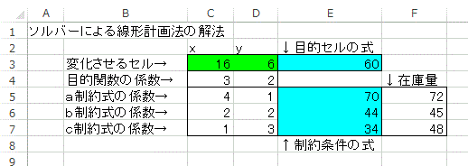 これより、最適解はx=16個、y=6個で、目的関数の値が60であることがわかります、