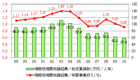 情報処理関係諸経費の対年間事業収入比と従業員1人当たりの推移(表の年は調査年度)(注)
