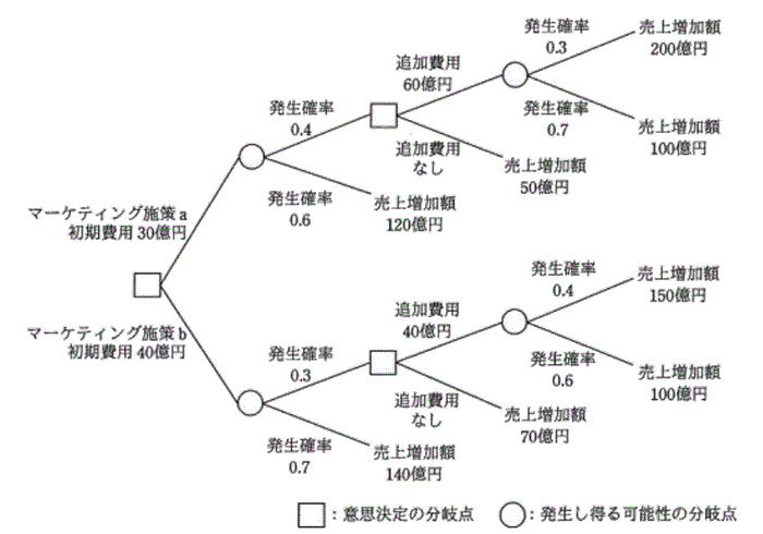 ビッグデータ分析の手法の一つであるデシジョンツリーを活用してマーケティング施策の判断に必要な事象を整理し,発生確率の精度を向上させた上で二つのマーケティング施策a,bの選択を行う。 マーケティング施策を実行した場合の利益増加額(売上増加額-費用)の期待値が最大となる施策と,そのときの利益増加額の期待値の組合せはどれか。