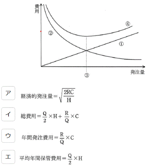 図は,定量発注方式を運用する際の費用と発注量の関係を示したものである。 図中の③を表しているものはどれか。 ここで, 1回当たりの発注量をQ,1回当たりの発注費用をC,1単位当たりの年間保管費用をH,年間需要量をRとする。 また,選択肢ア~エのそれぞれの関係式は成り立っている。