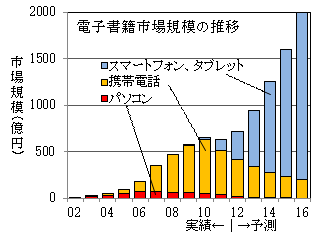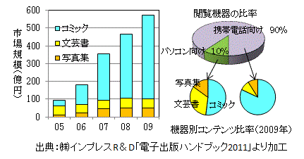 それを利用して携帯アプリとして電子書籍のビューワー機能が提供されるようになり、2004年には携帯電話向けの電子書籍配信サイトも急速に増加した。その後、日本の電子書籍市場は携帯電話が中心になり、2009 年度では携帯電話向け市場が全体の89%を占めるまでになった。