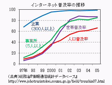 このような環境の整備により、インターネット人口は急速に拡大した。2005年では、家庭でのインターネット接続は80%を超え、すでに飽和期に入ったといってよい。