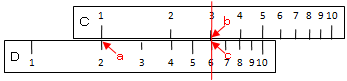 計算尺の基本構成は、対数目盛を刻んだ2つの板からなっている。上尺の目盛1に下尺の目盛aを合わせて、上尺の目盛bにカーソルを合わせれば、対応する下尺の目盛cがa×bの値になります。逆の操作を行えば除算を行うことができる。