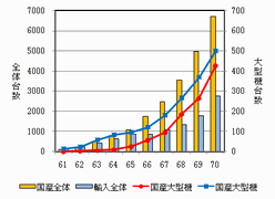 また、大型機(統計区分により、後で中型機とされるものもあるが)では、1960年代前半では大学や国の機関を中心に設置されていたが、後半になると急速に民間企業へも広まり、1960年代末には、輸入機と肩を並べるまでになった。