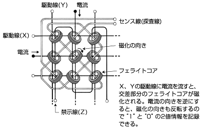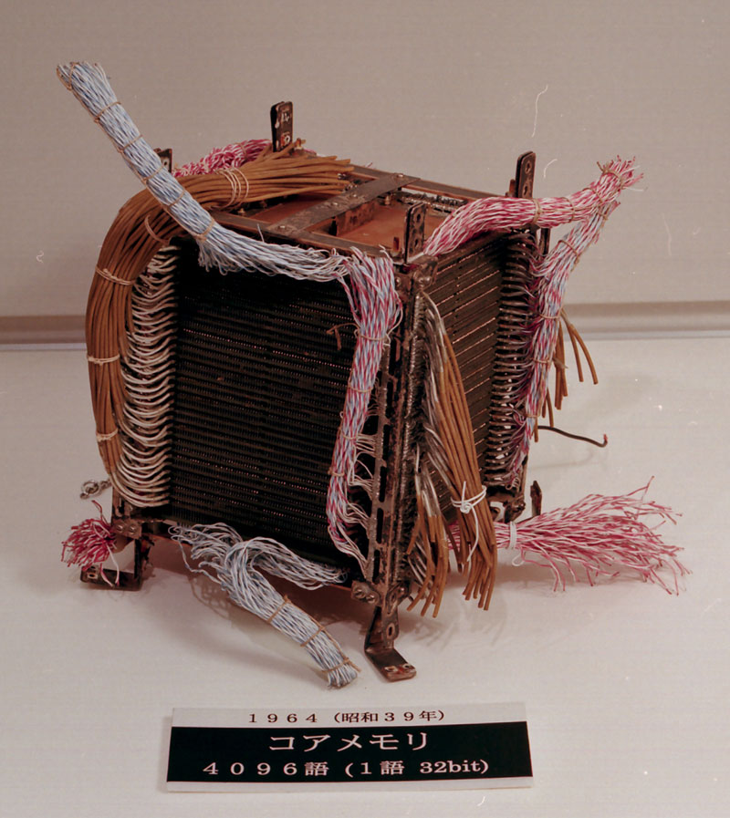 それに対して、磁気コアメモリは格子状に並んだフェライトに電荷をON/OFFして記憶する仕組みである。高速・小型化が可能になる。1950年代後半からは磁気コアメモリが主流になり、1970年代初めに半導体RAMになるまで、長い間用いられていた。