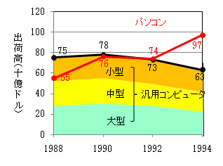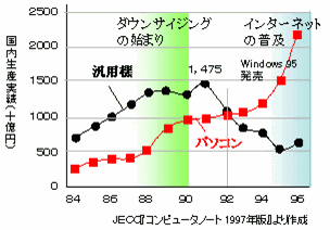 ![]() ダウンサイジング(日本) 出典:日本電子計算機「コンピュータノート 1997年版」より作図 |