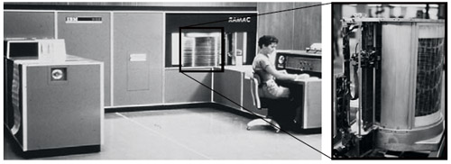 コンピュータの初期の頃は、主記憶装置(メモリ)には水銀遅延線やウィリアムス管、その後、磁気ドラムが用いられるようになった。磁気ドラムは、円筒の表面に磁気記録面をつくり、それを高速回転させてアクセスする。機械的な動作のため低速であるし、容量を大きくするには装置が巨大になってしまう。