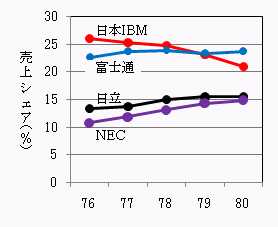 ![]() 汎用コンピュータ売上高シェアの推移 出典:「コンピュータ会杜10杜の実力分析」 『コンピュートピア』1982年11月号 |