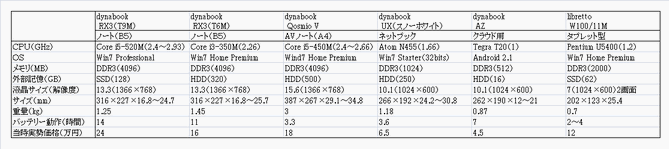 ノートパソコンの分野では、東芝がリーダーシップをとってきた。2010年頃のノートパソコンの典型的な仕様として、同社の代表的機種を列挙する。