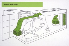 1980年代は大型汎用コンピュータの全盛期であった。その高速処理に対応できる大量高速プリンタが求められる。それに応えたのがレーザ・ページプリンタである。その後高速化が進み、毎分100ページ以上の文字通り目にもとまらぬスピードになった。