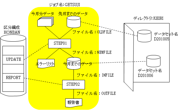 先月までのデータを累積したファイルに、今月のデータをカードから与えて更新し、今月までの累積ファイルを作り、それからレポートを作成する処理を例とする(これは説明のためのものであり、現実的には適切とはいえない)。