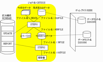 例えば、ディレクトリ「KEIRI」に存在するデータセット「D201005」をアクセスする場合、プログラムでその名称を指示したのでは、別のデータセット「D201005」をアクセスするときには、プログラムを修正しなければならない。それを回避するために、プログラムでは論理的な名称(ファイル名)、例えば「OLDFILE」としておき、実行時にJCLで、OUTFILE と KEIRI.D201005 を関係づけるのである。