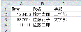 番号,氏名,学部 123456,鈴木太郎,工学部 987654,佐藤花子,文学部 111111,佐藤二郎, (空白セルがあるとき「,」が付く) (最後に空白行がある) | 文学部