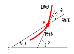 等角螺旋(指数螺旋、ベルヌーイの螺旋)をベースにして、画像を描きます。等角螺旋とは、時刻 t において r = eat + b x = r*cos(t) y = r*sin(t) で定義される螺旋です。 at+b が増加するのに伴い間隔が広く)なります。 等角螺旋の特徴は、 「螺旋の各点における動径と接線の角度θが常に同じ」ことです。 接線の勾配は、m = tan(α) = (1 + a*tan(t))/(a - tan(t)) になります。 右図は、Pの移動方向の接線を描いたものです。 画面サイズの都合から a =0.1 に固定し、 b をいろいろ変化させて複数の螺旋を設定し それに色を付けたものです。