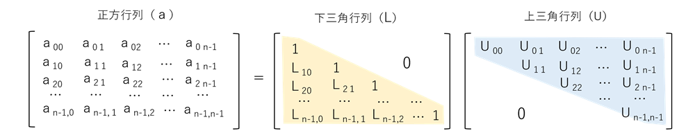 LU分解とは、下図のように、正方行列(a)を下三角行列(L)と上三角行列(U)の積に分解することです。lの対角要素は1になります。