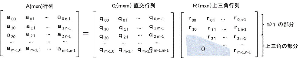 QR分解とは、下図のように、m×n の行列Aを m×m の直交行列Qと m×n の上三角行列R の積に分解することです。