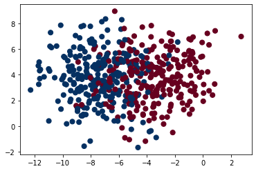 plt.scatter(X[:, 0], X[:, 1], c=y, s=50, cmap='RdBu')