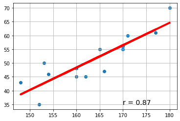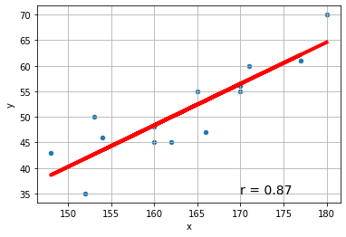 r = np.sqrt(r2) # 相関係数:r = ±sqrt(r2) =0.87