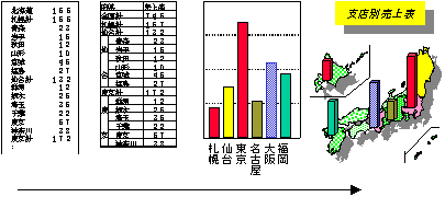 グループウェアではあまり問題にならないことが,情報検索系システムの普及では大きな問題になることがある。たとえば「支店別府県別売上集計表」を得たいとする。データベースが整備されており,適切な汎用的なツールがあれば,ベタ打ちの数表の形式でそれを入手するのは至極簡単である。しかし,エンドユーザは,それでは満足しない。図7−5のように,まず,罫線を引きたがるが,そのデザインは帳票により異なるので,汎用ツールでは対処できず,個別の処理が必要になる。さらに,グラフ化をしたがるが,通常の棒グラフなどでは満足せず,地図に製品の形で大きさを表すような形式にまでしたがる。すなわち,エンドユーザは,情報がほしいのではなく,きれいな帳票がほしいのである。これではエンドユーザの生産性は向上しない。