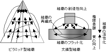 - トップと一般社員が直接に情報を交換できるようになると,中間管理職の任務のうち,単に上と下との間のパイプ役としての任務は不要になります。それにより,組織そのものが階層の深いピラミッド型組織からフラットな文鎮型の組織になります。