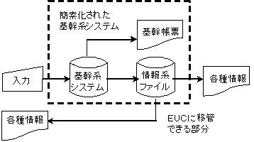 情報検索系システムの普及により,基幹業務系システムの規模を小さく簡素化できます。情報検索系システムが行なわれていないときには,図のすべての範囲を基幹業務系システムとして構築する必要がありますが,情報検索系システムが普及した段階では,点線の外部をEUCに任せて,基幹業務系システムは点線の内部だけをカバーすればよいことになります。